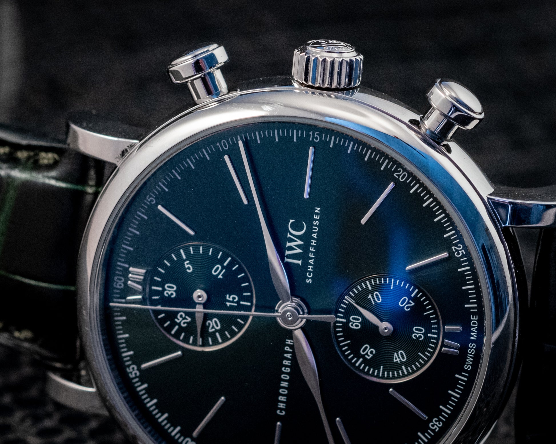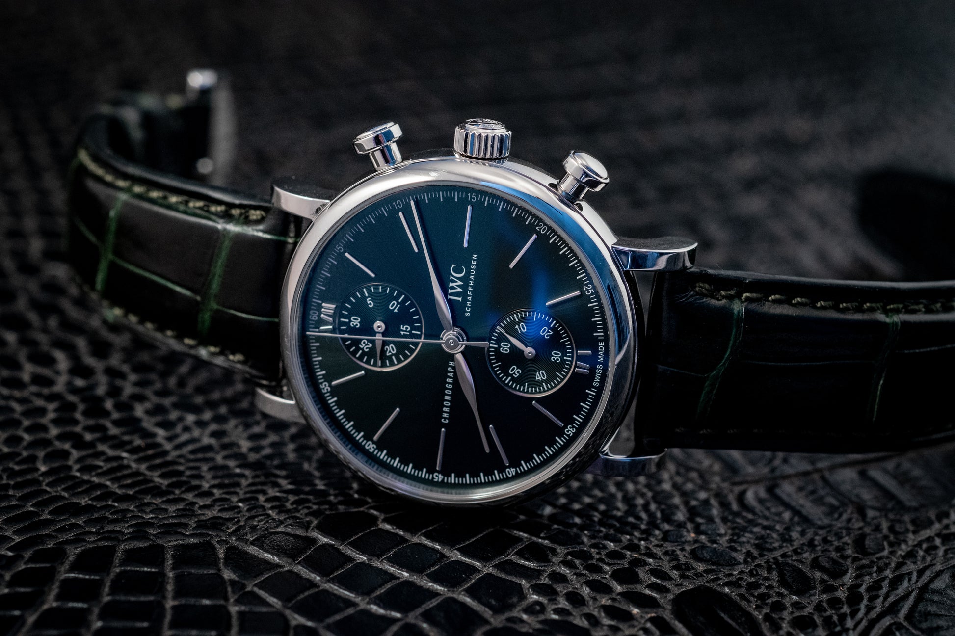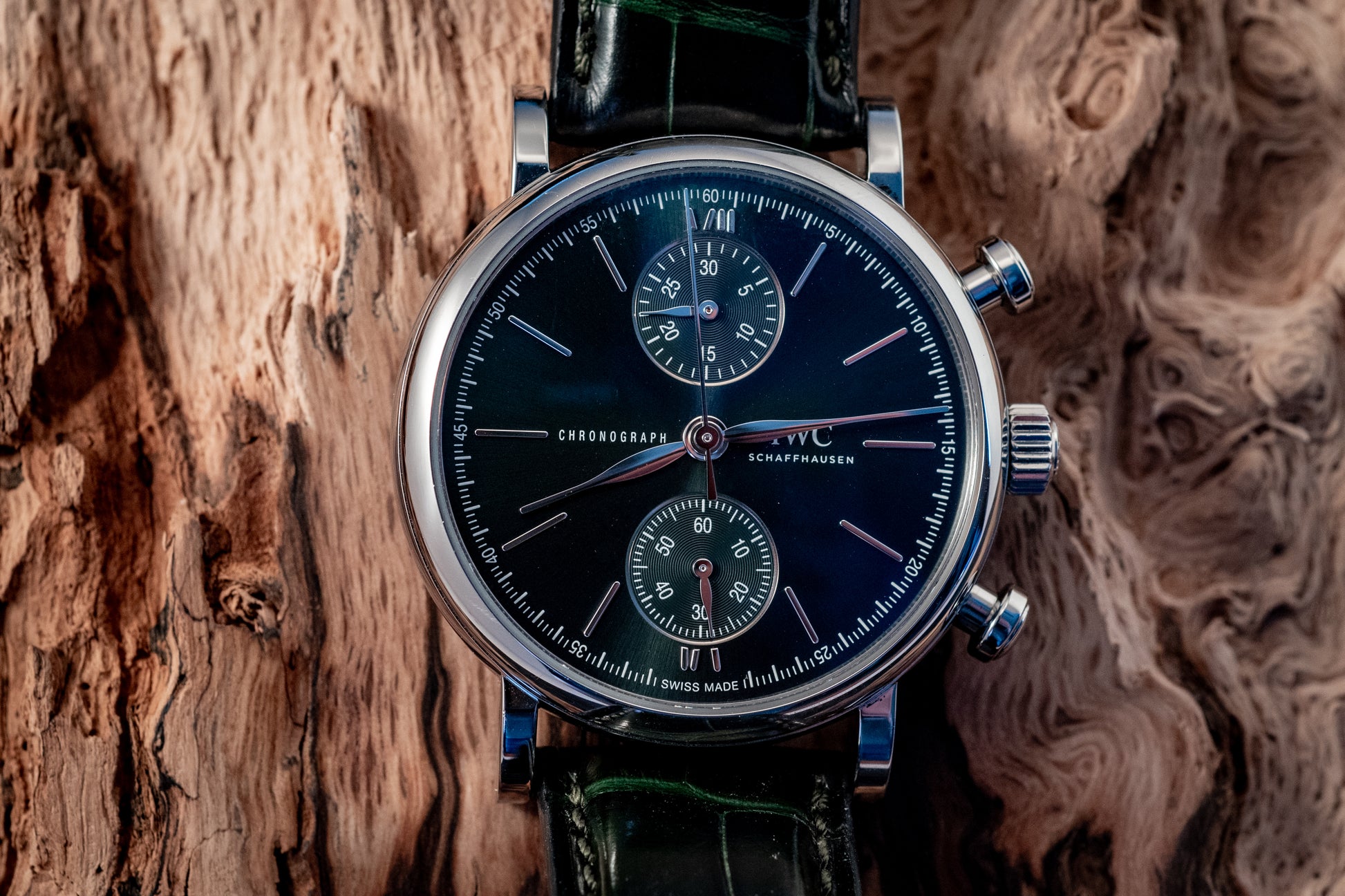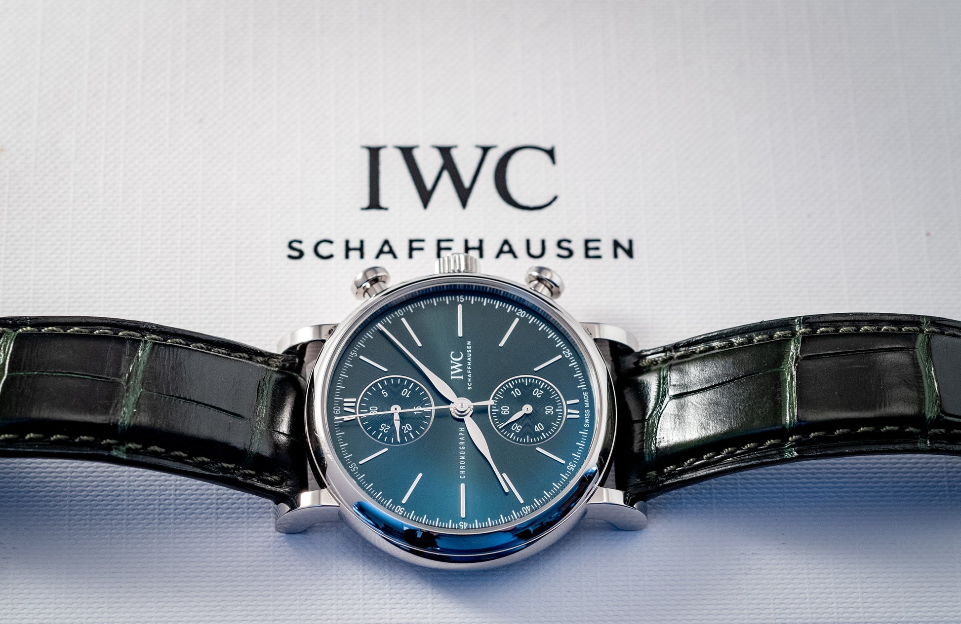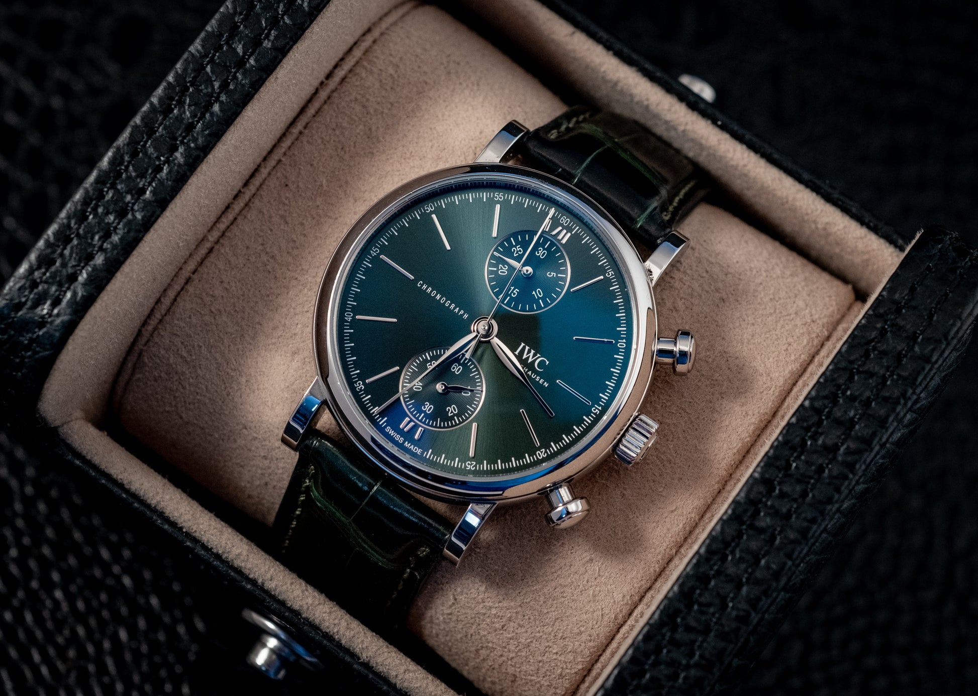 The IWC Schaffhausen Portofino Chronograph is known for its clean lines, elegant proportions, and everyday versatility, and the green dial on this example adds a bold yet sophisticated touch to an already timeless design.