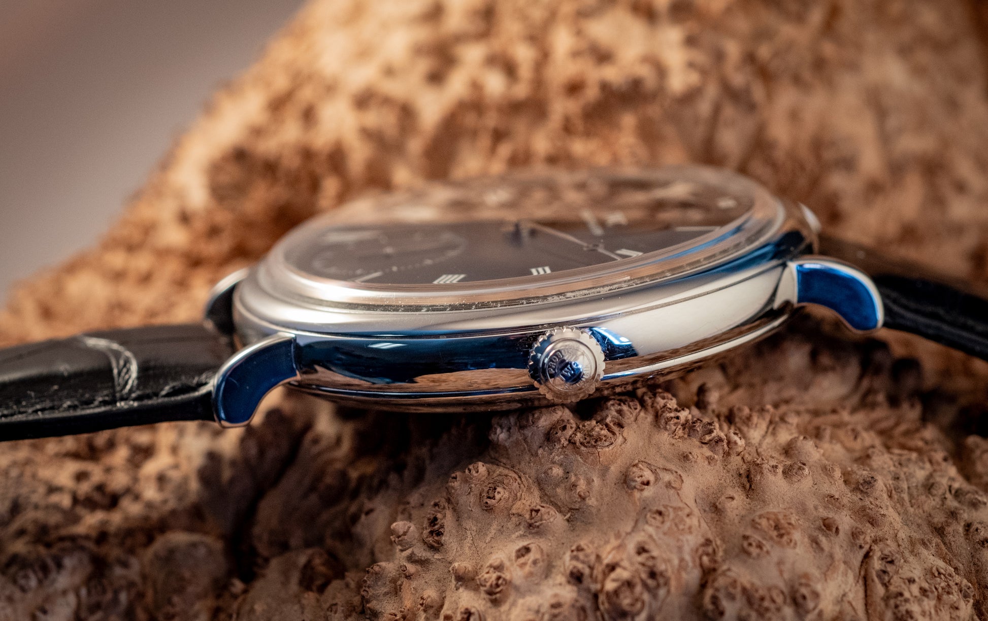Its clean, balanced dial showcases applied hour markers, slim feuille hands, and a small seconds subdial at 6 o’clock, delivering a layout inspired by traditional pocket watches. The expansive dial surface enhances legibility while emphasizing the watch’s minimalist, dress-oriented design.