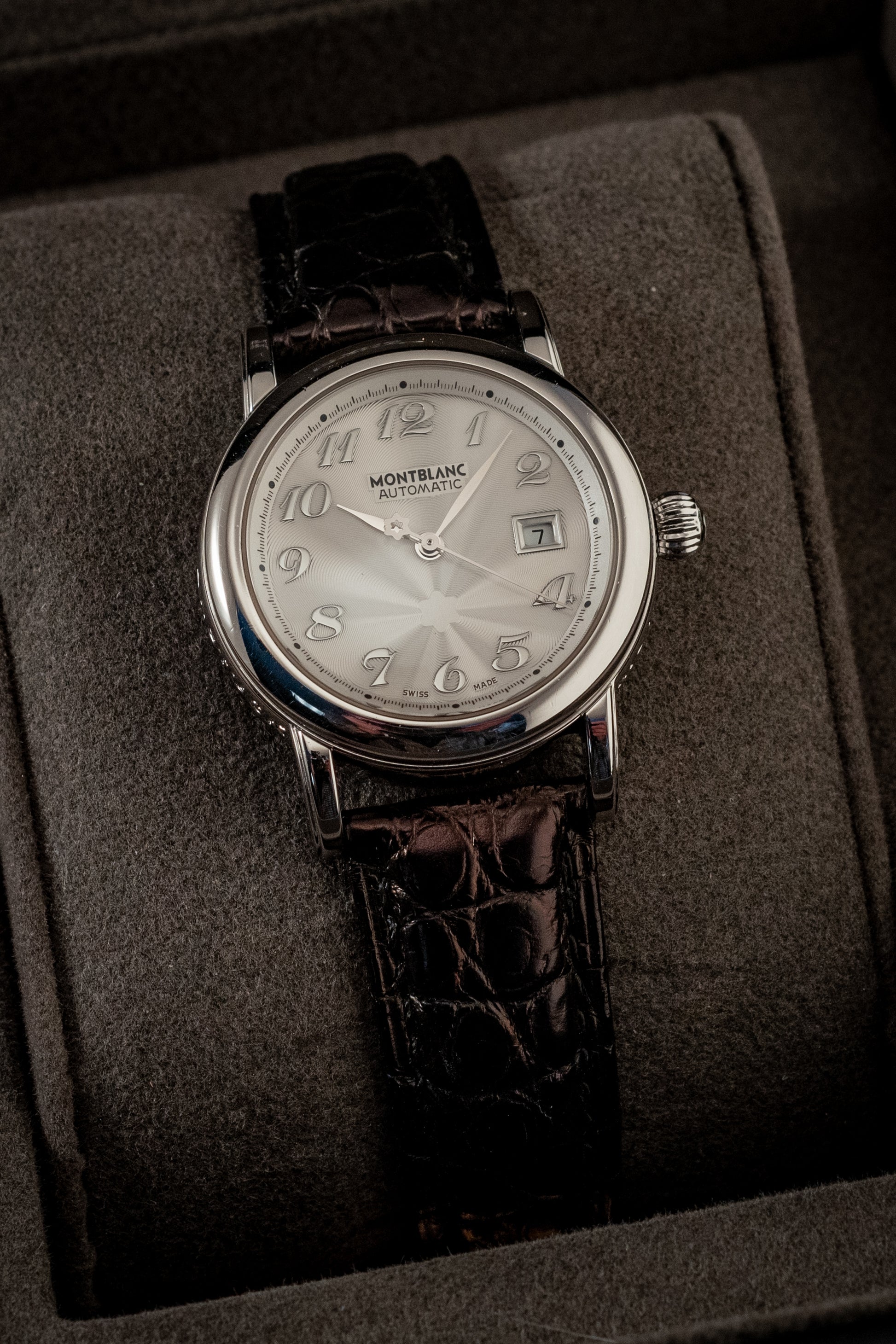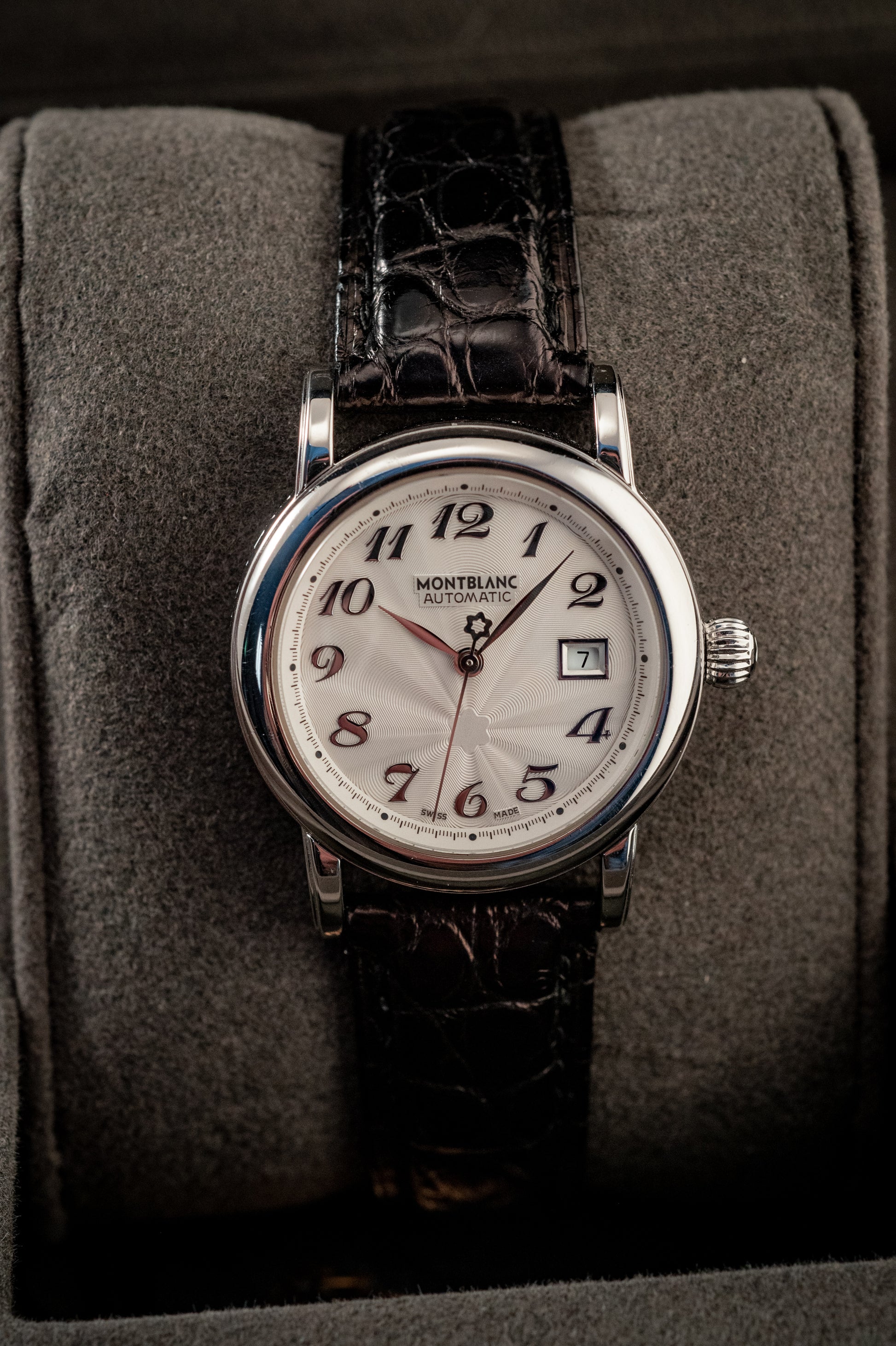 The stainless steel case, measuring 32mm in diameter, presents a sleek and balanced aesthetic that suits both formal and everyday wear. Its polished bezel and smooth lines reflect Montblanc’s signature attention to detail, while the scratch-resistant sapphire crystal protects the dial, ensuring clarity and long-lasting brilliance.