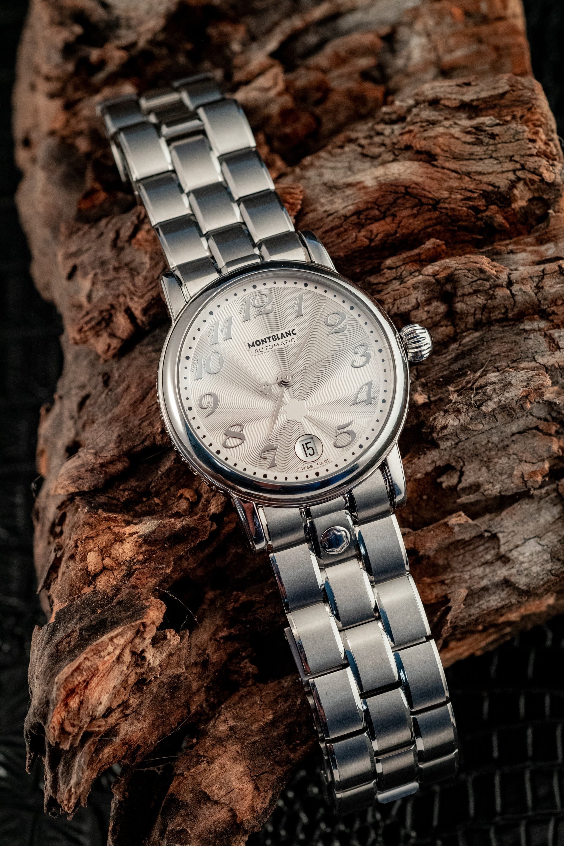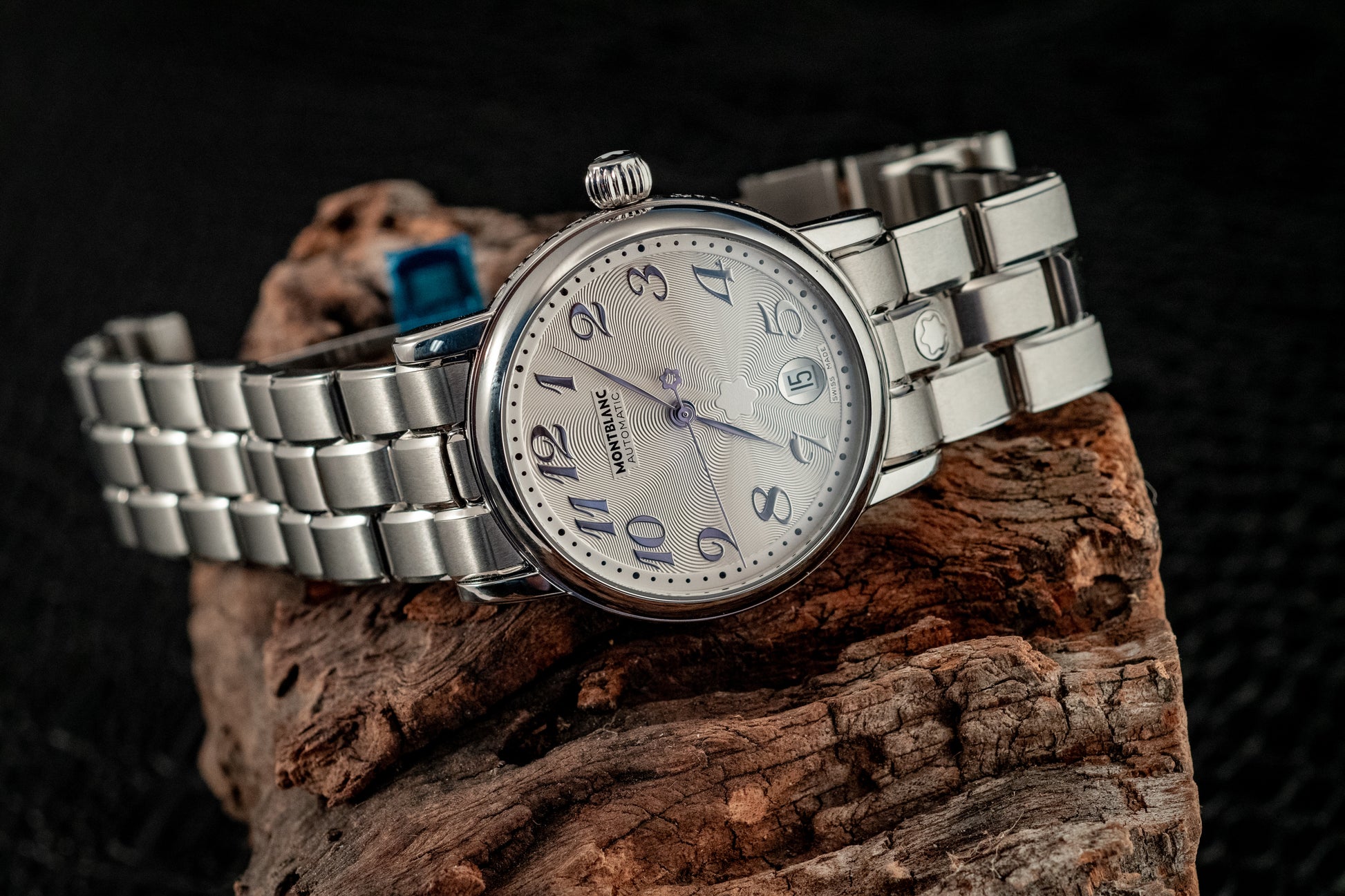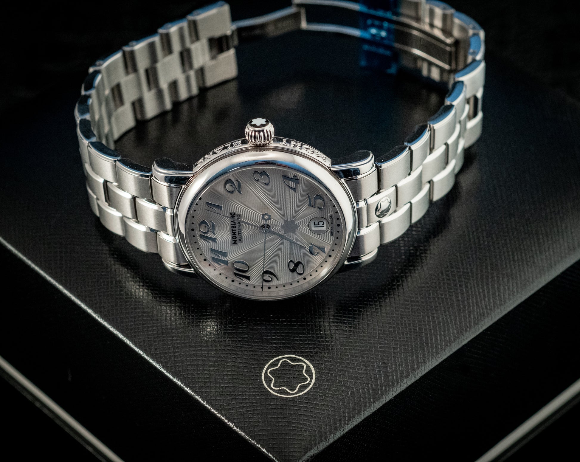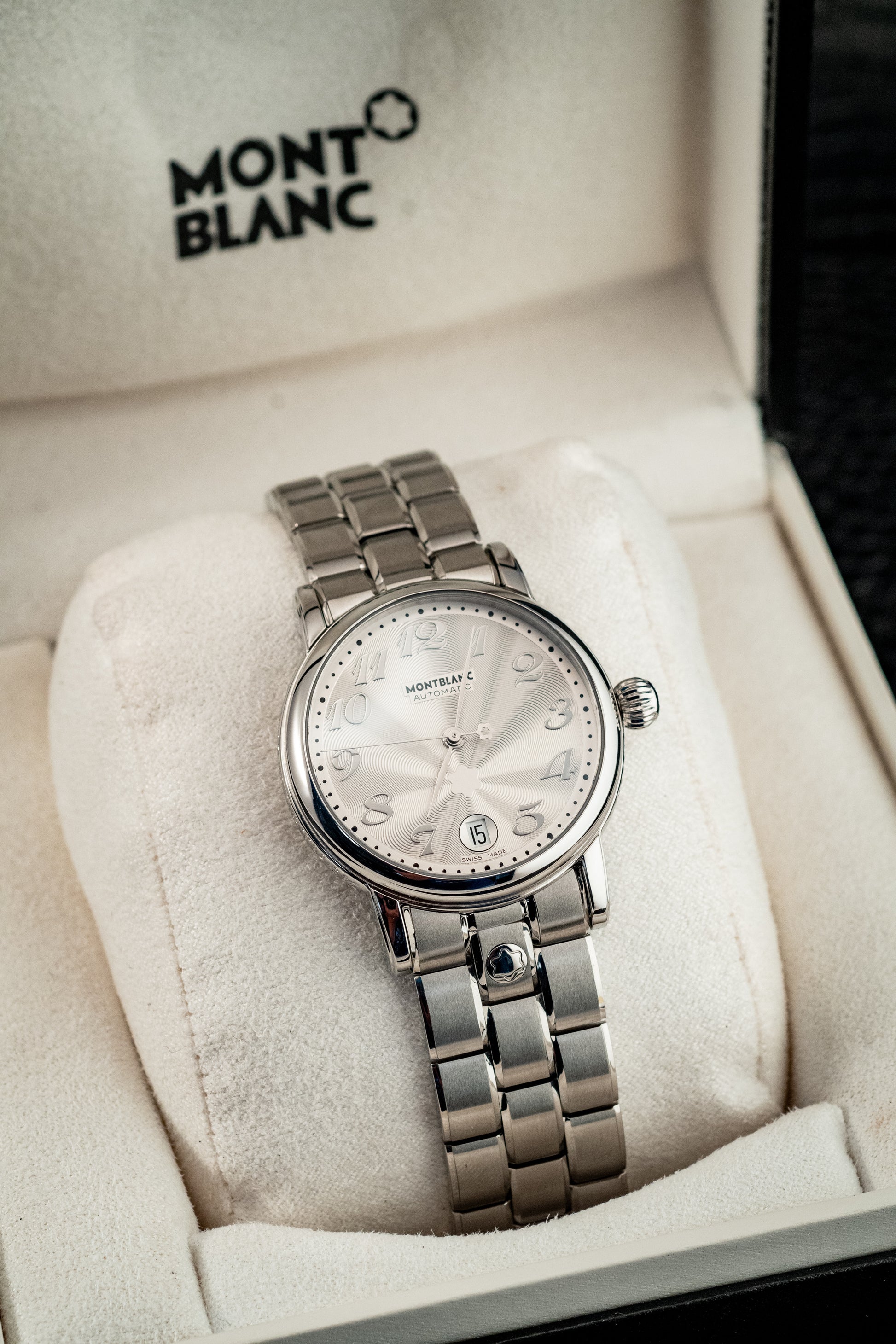 Powered by a Swiss automatic movement, the Meisterstück Star delivers reliable performance and smooth operation, visible through its transparent sapphire caseback. The stainless steel bracelet enhances both comfort and durability, while seamlessly complementing the watch’s refined aesthetic.