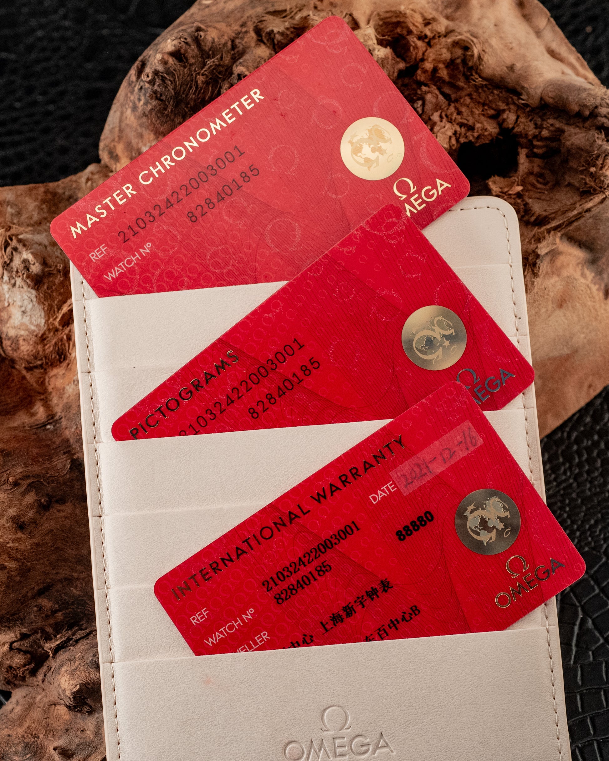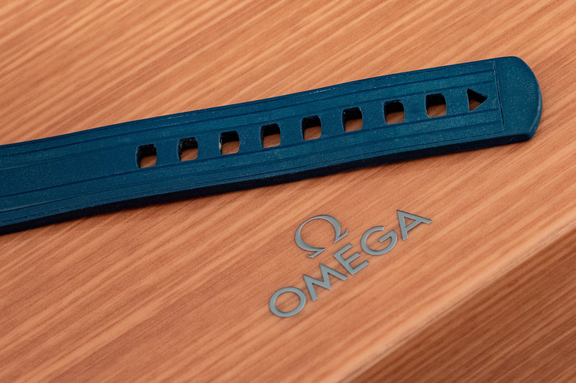 The captivating blue ceramic dial, laser-engraved with Omega’s signature wave motif, gives the watch its distinctive character. Rhodium-plated skeleton hands and raised hour markers, filled with white Super-LumiNova, ensure exceptional visibility in any lighting condition. A discreet date window at 6 o’clock maintains perfect symmetry and balance across the dial.