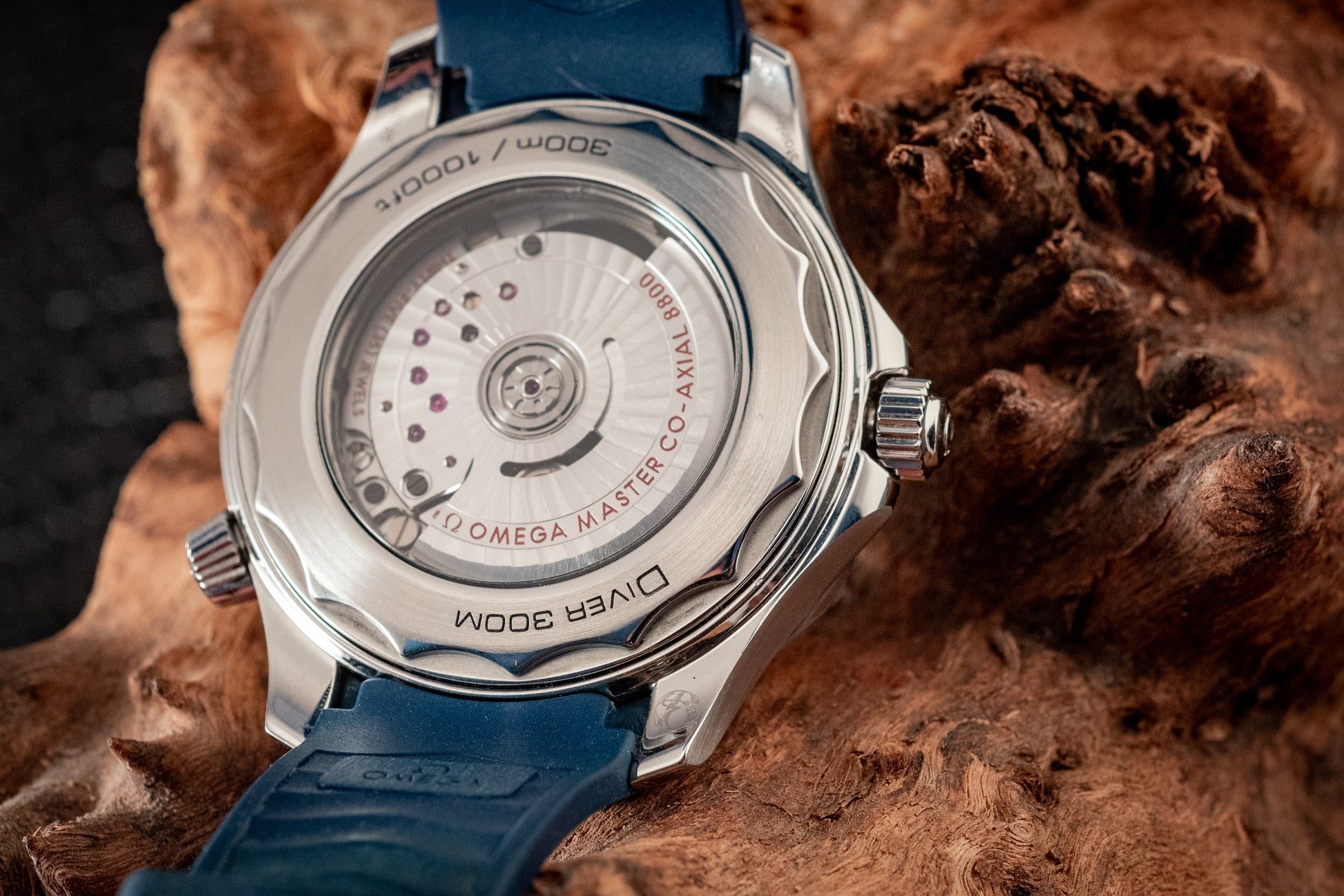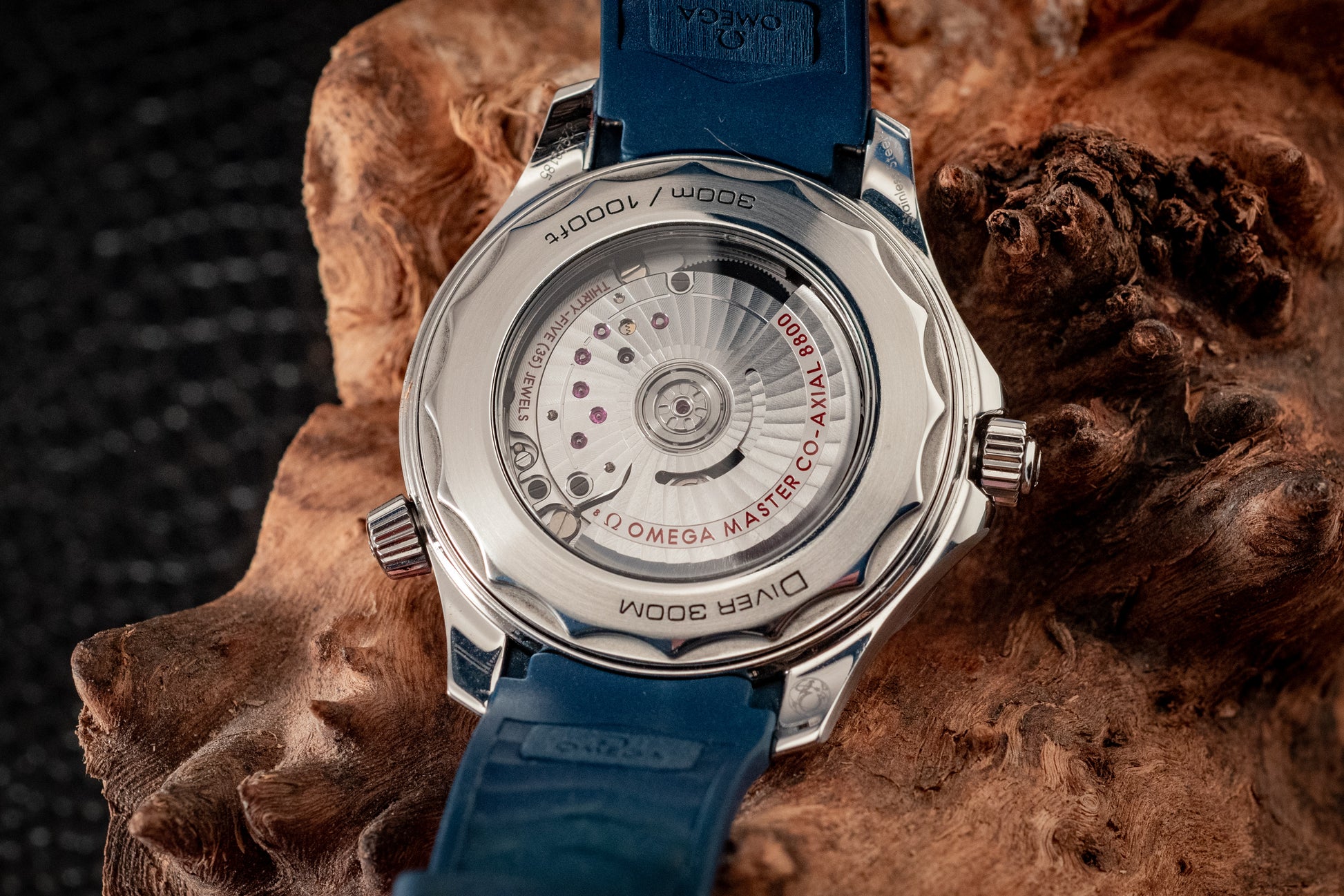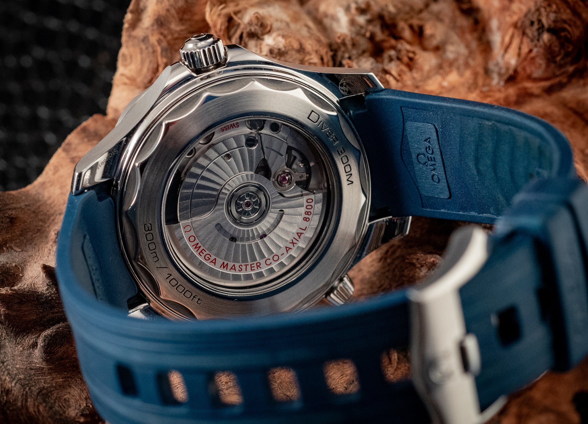 At its core, this Seamaster is powered by the Omega Co-Axial Master Chronometer Caliber 8800, a self-winding movement visible through the transparent sapphire caseback. This powerhouse movement offers 55 hours of power reserve, magnetic resistance up to 15,000 gauss, and is METAS-certified for industry-leading accuracy and durability.