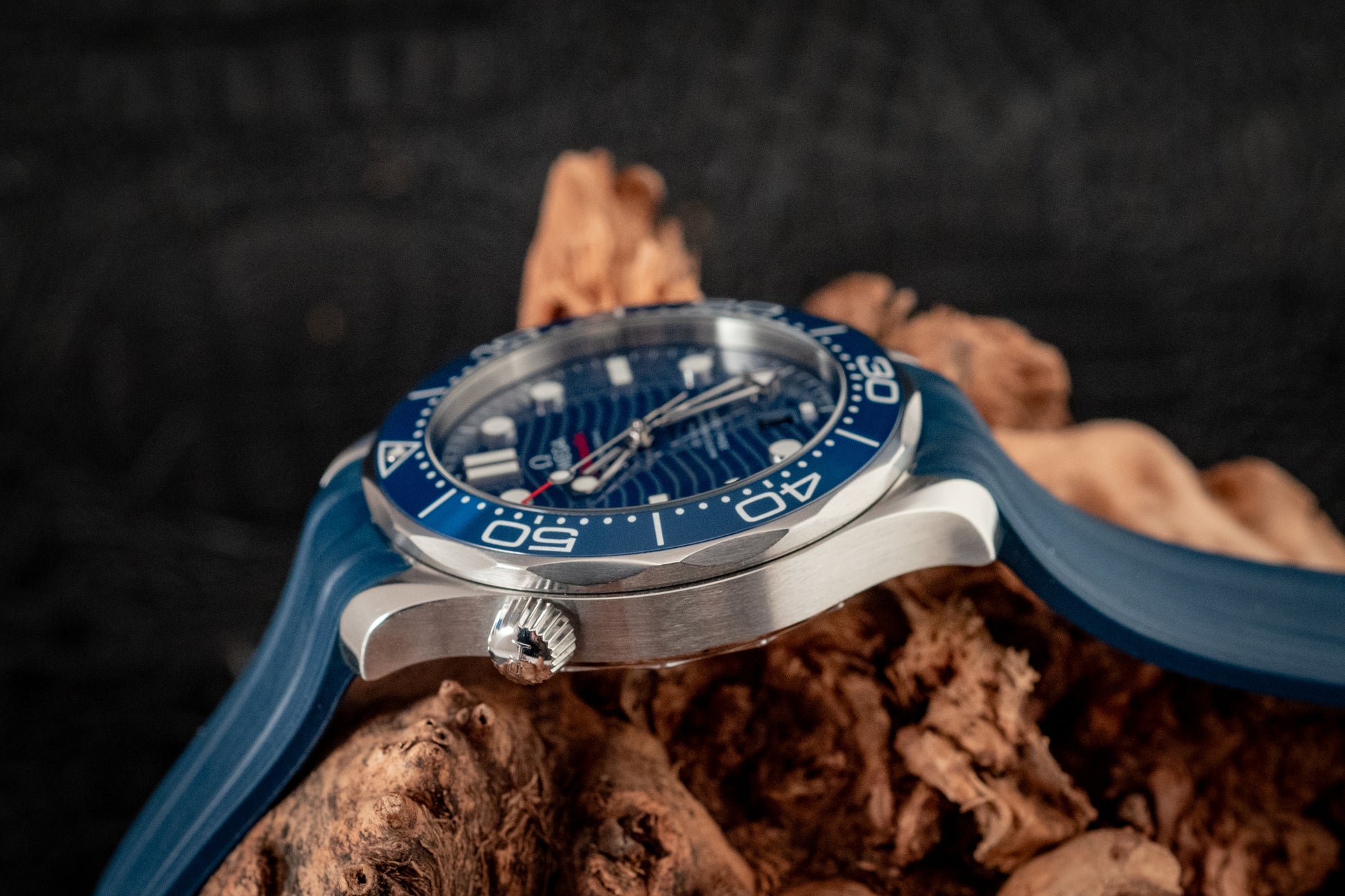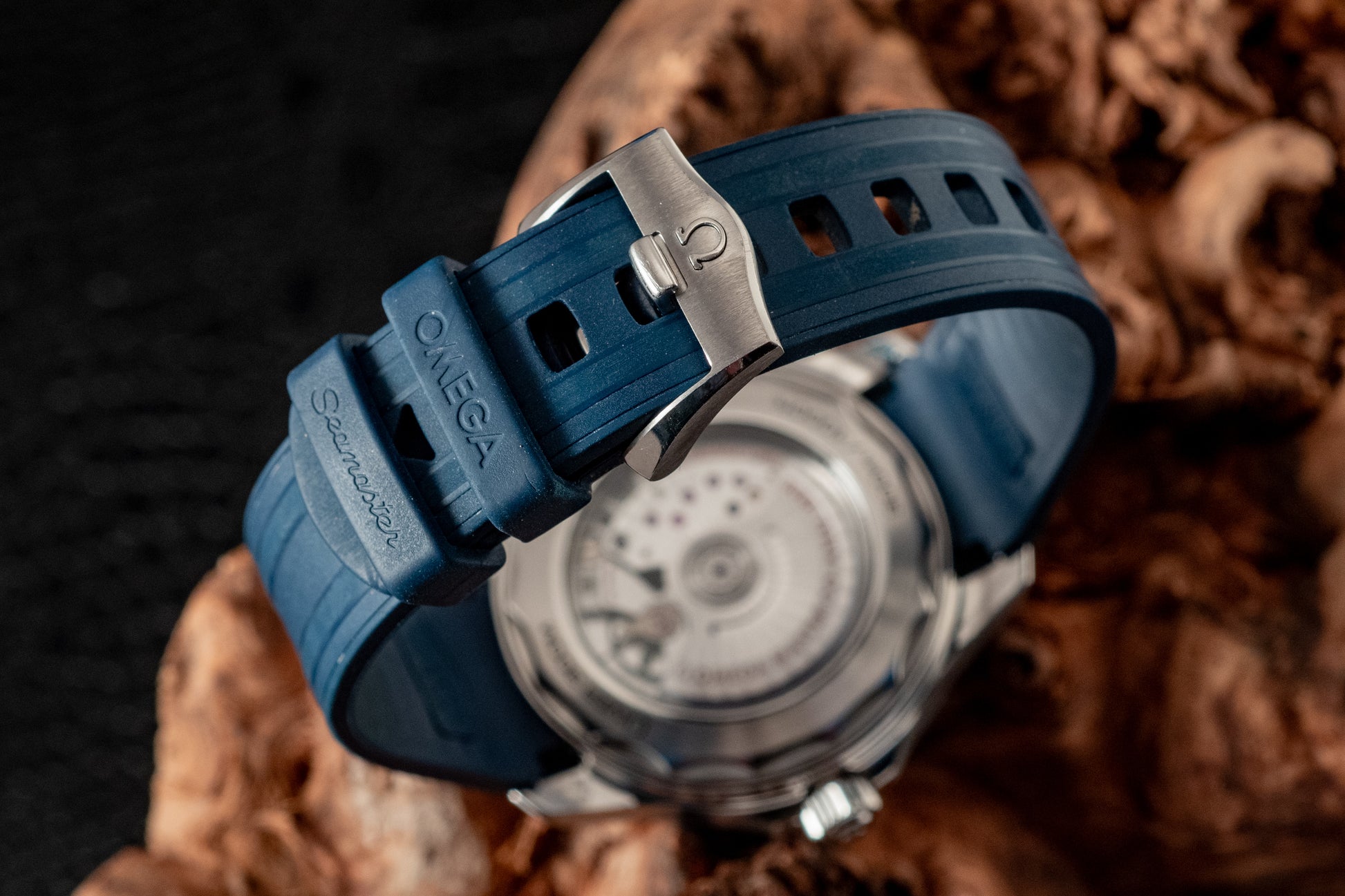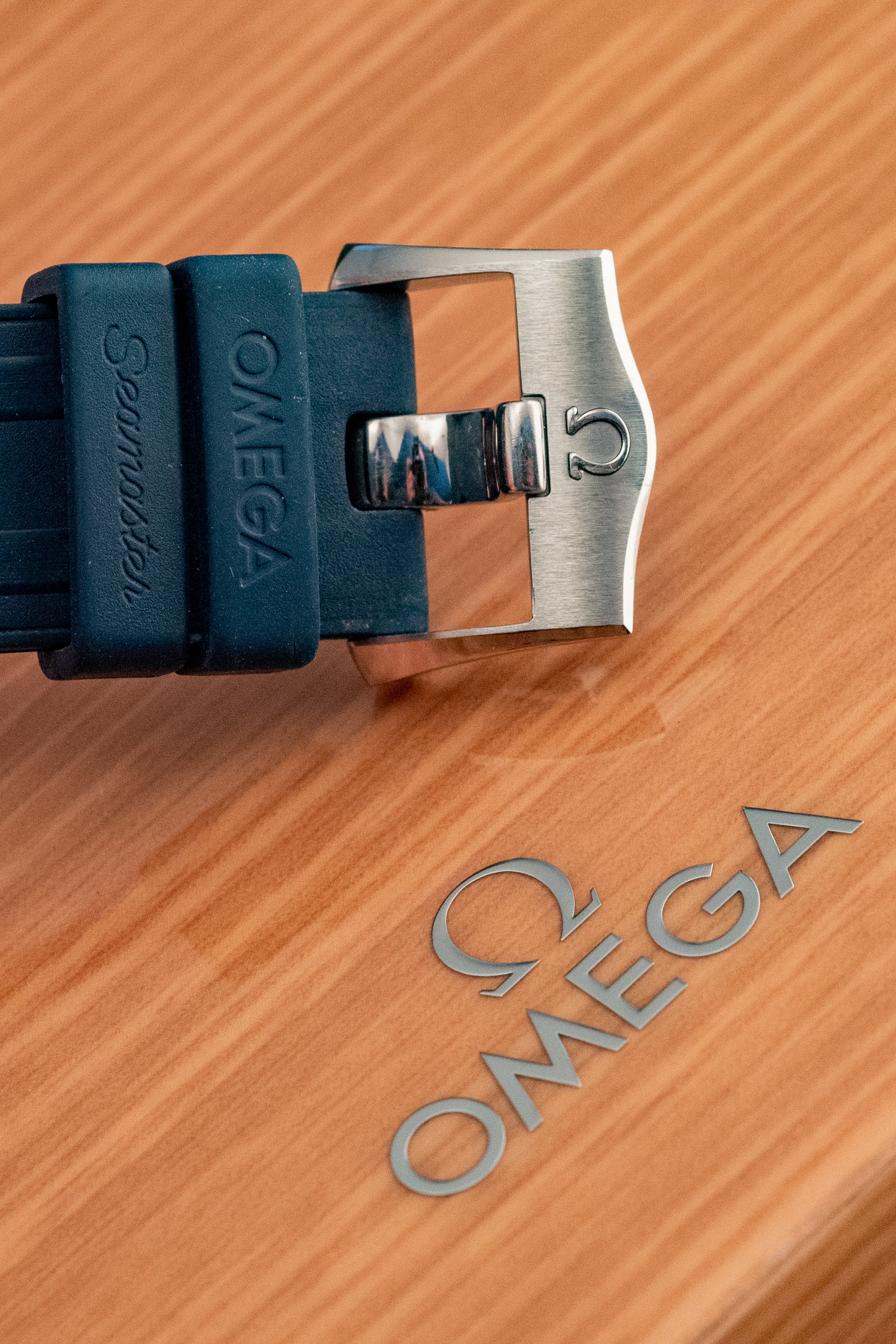 The 42mm stainless steel case strikes the ideal balance between durability and sophistication. Its polished and brushed surfaces reflect Omega’s meticulous craftsmanship, while the blue ceramic unidirectional bezel with a white enamel diving scale provides both style and reliability. The screw-down crown and helium escape valve at 10 o’clock affirm the watch’s professional diving heritage, ensuring readiness for any underwater adventure.