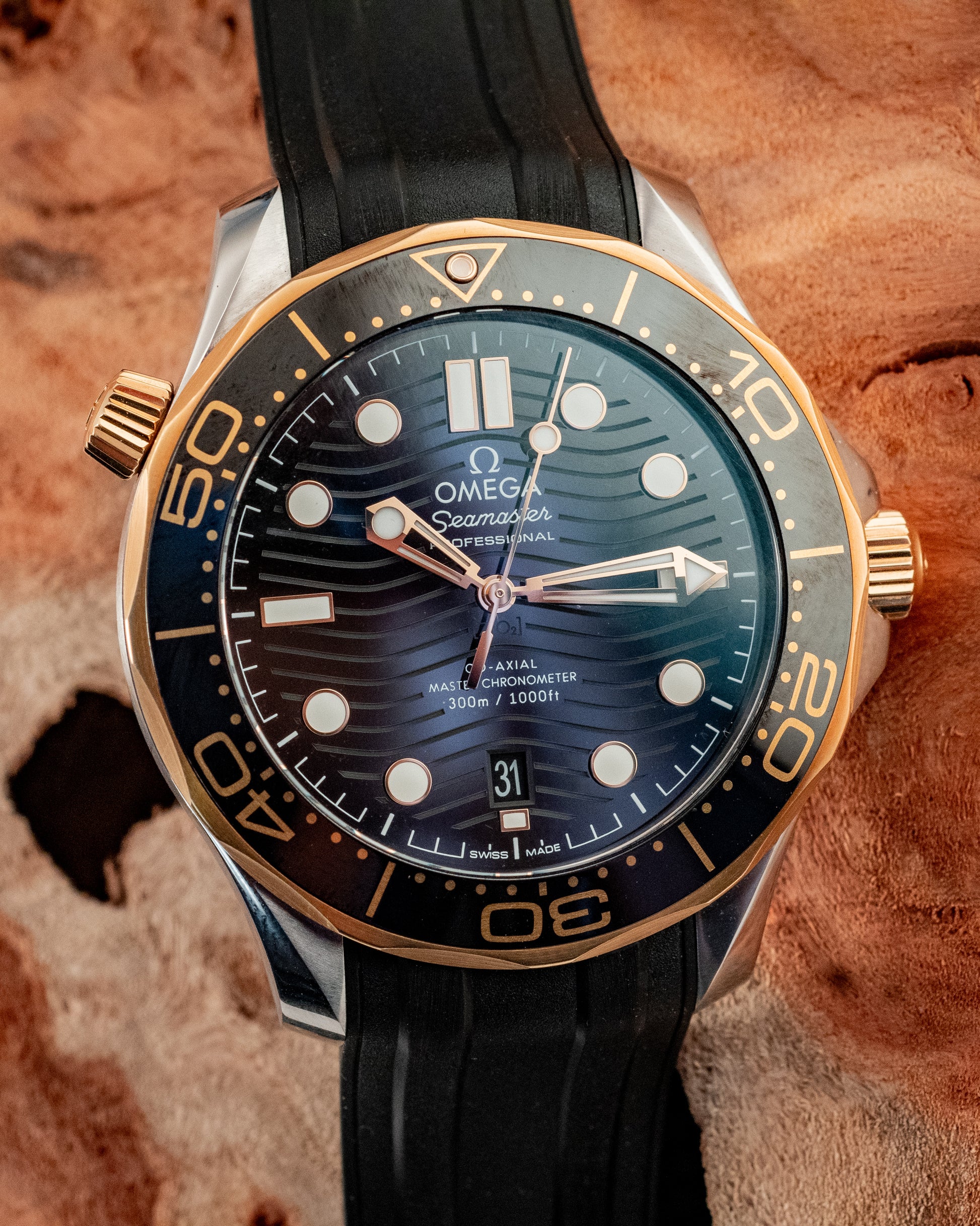 The Seamaster 300M Diver is powered by the Co-Axial Master Chronometer Calibre 8800, which is not only exceptionally precise but also resistant to magnetic fields, making it a robust companion for any adventure. The watch includes a date window at 6 o'clock, adding to its practicality. With its helium-escape valve and water resistance up to 300 meters, this model is engineered for the rigorous demands of the sea yet retains a stylish flair for any occasion.