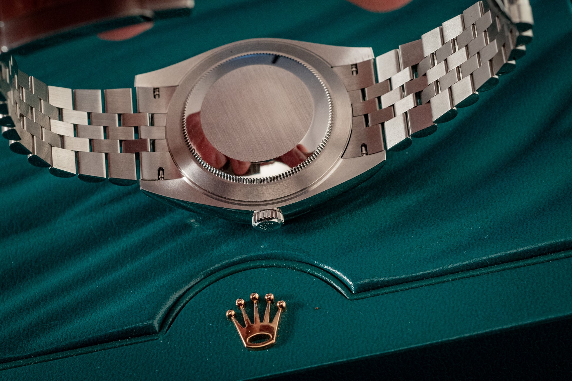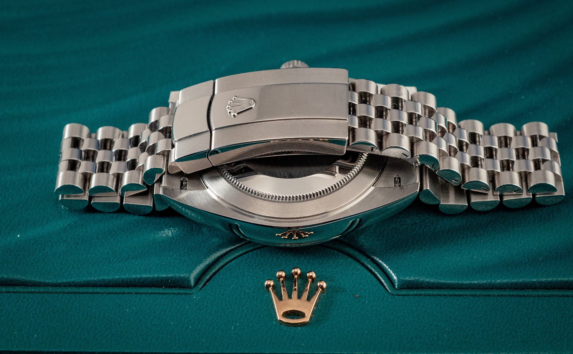 The watch’s defining feature is its fluted 18K white gold bezel, which catches the light beautifully and adds a luxurious touch to the sleek stainless steel case. Its Jubilee bracelet, composed of five-piece links, offers unparalleled comfort and a polished aesthetic that enhances the watch’s classic appeal. The concealed Crownclasp completes the bracelet with seamless refinement.