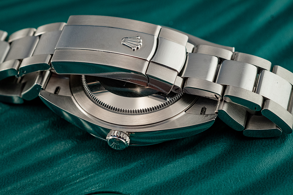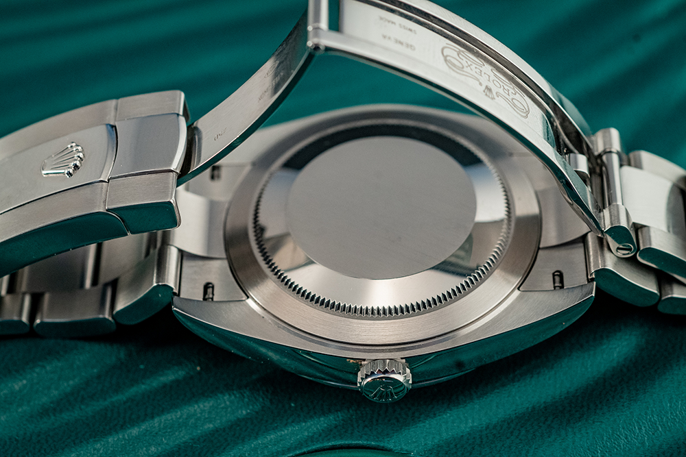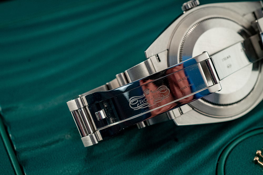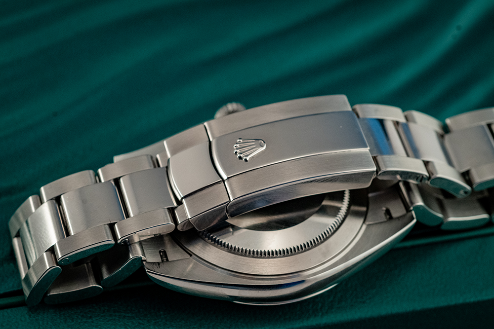 The silver Oyster bracelet is known for its robustness and comfort, and is an iconic Rolex feature. The polished and brushed finishes add a touch of refinement. The smooth, polished silver bezel adds an understated yet sophisticated touch, framing the dial beautifully. This watch comes complete with its original box and papers, which not only assure authenticity but also add value to this exquisite timepiece.