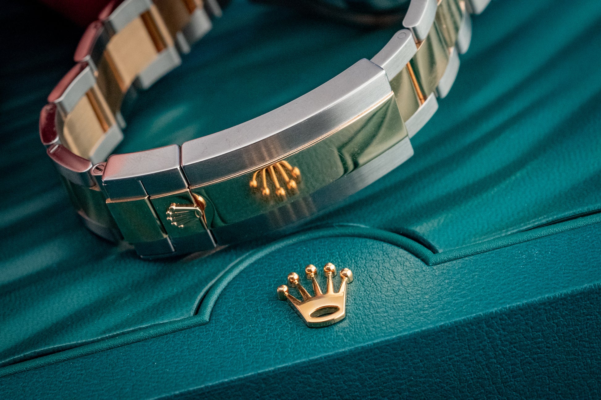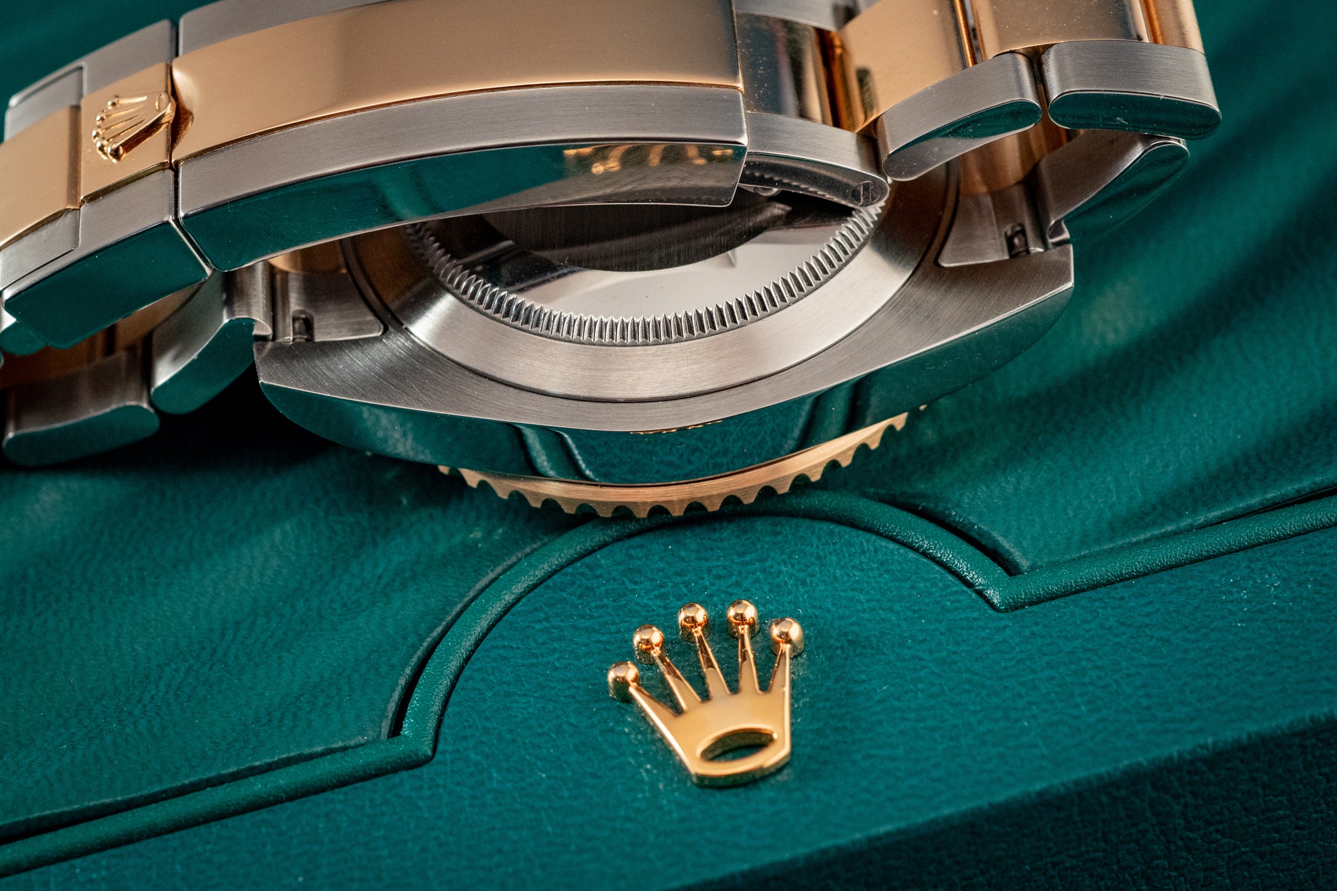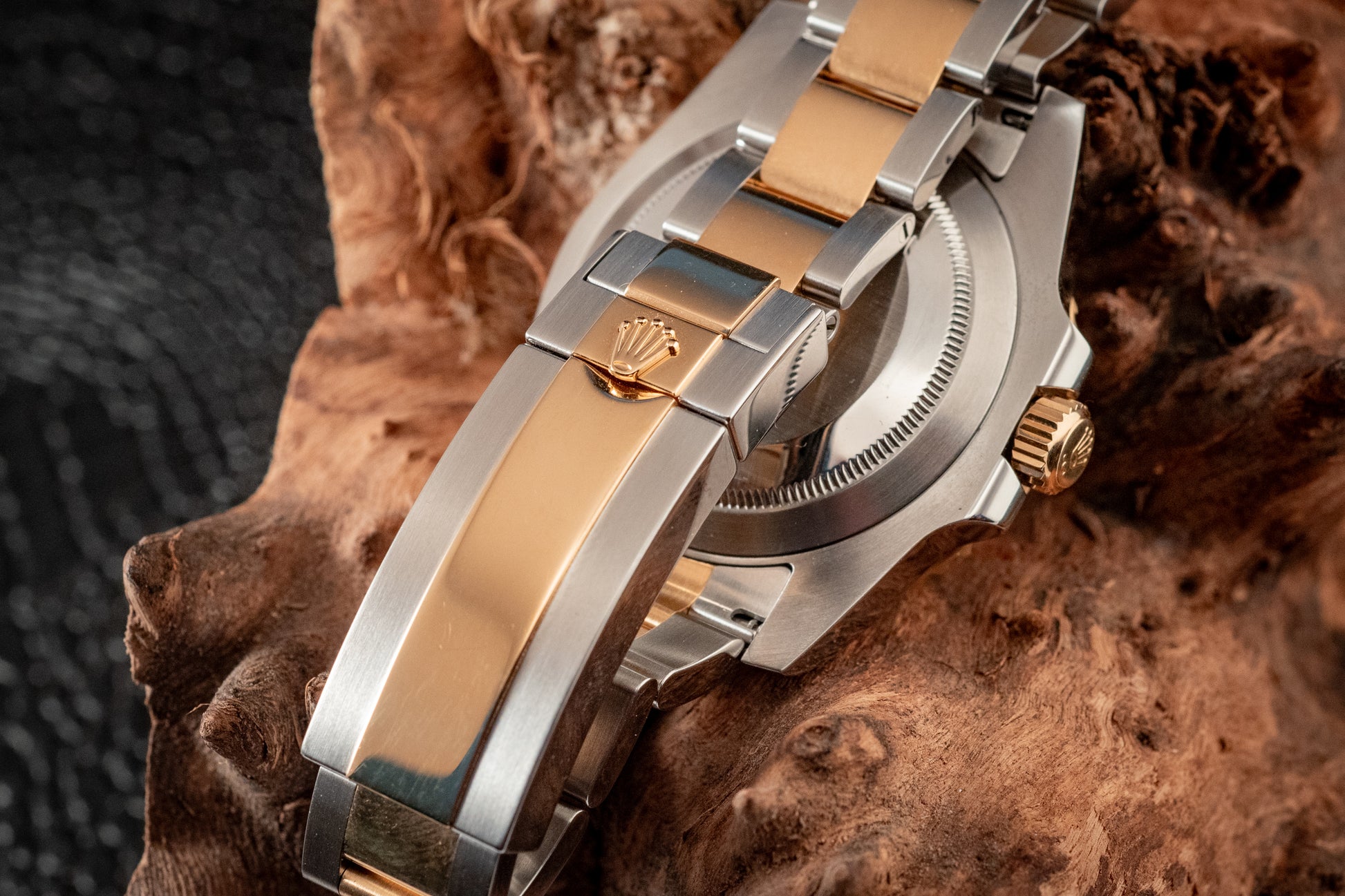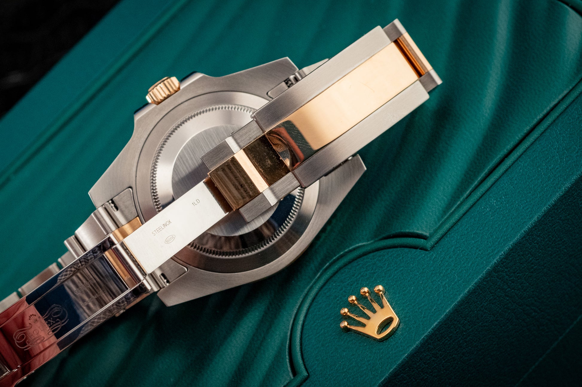 The two-tone Oyster bracelet, combining polished 18K yellow gold center links with brushed stainless steel outer links, is both elegant and robust. It’s secured with the Oysterlock clasp and features the Glidelock extension system for a comfortable, adjustable fit.