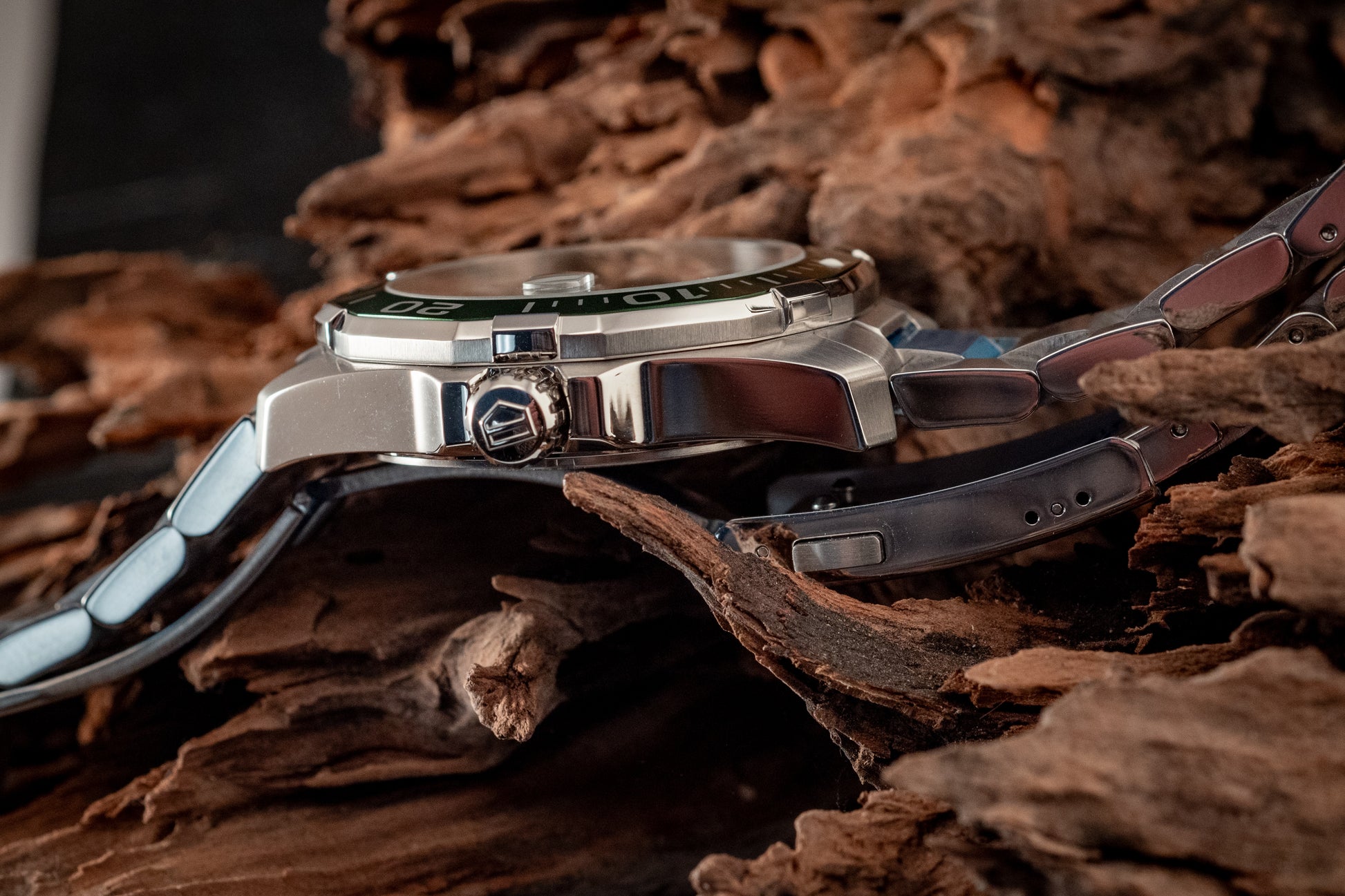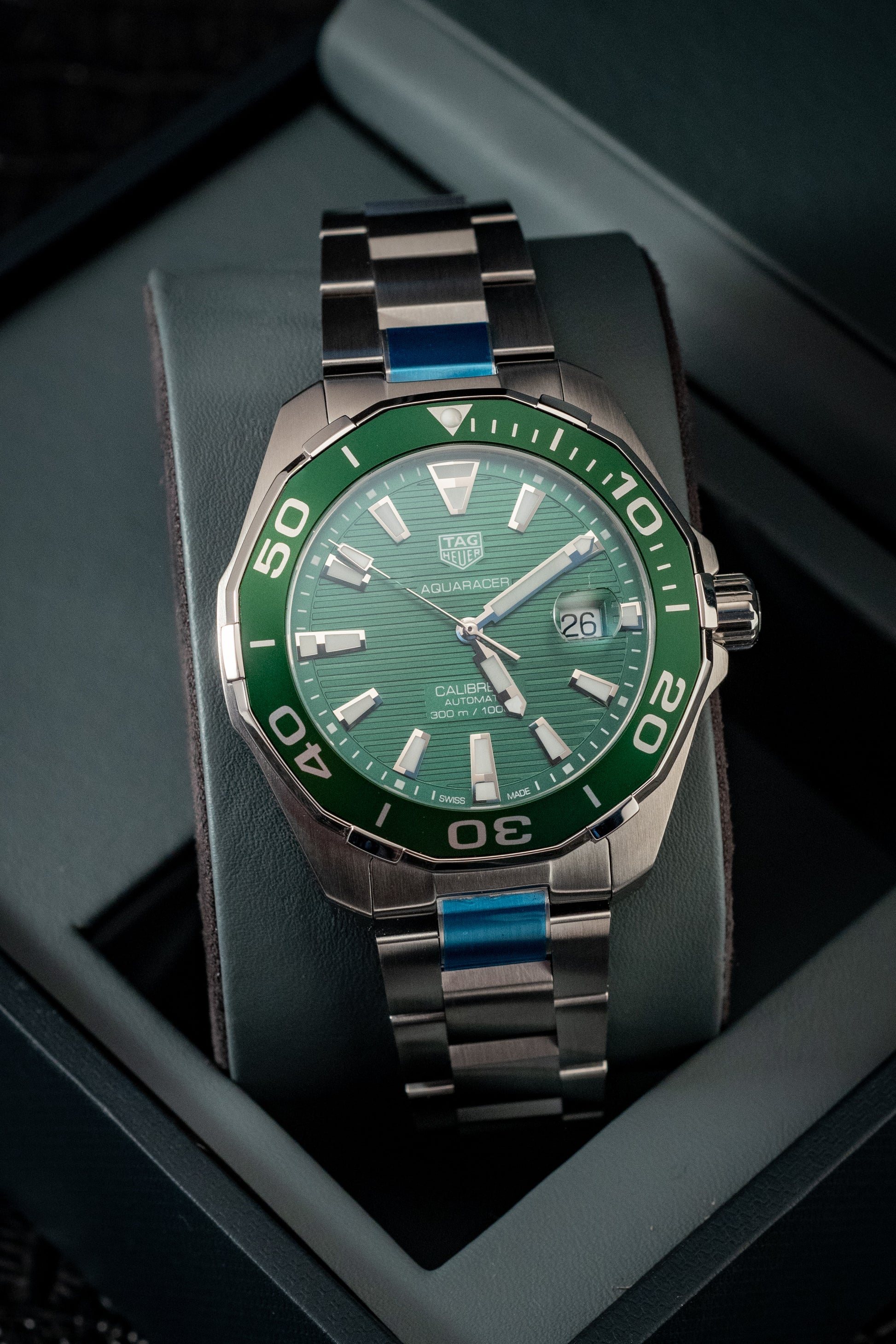The watch features a 43mm stainless steel case with a unidirectional rotating bezel, designed for professional diving functionality. Its sleek, angular design embodies the spirit of TAG Heuer’s Aquaracer line—robust yet elegant enough for everyday wear. The standout green striped dial is both vibrant and distinctive, showcasing a dynamic pattern that plays beautifully with the light. The dial is complemented by luminous hands and hour markers, ensuring superior legibility in any environment, while the date window at 3 o’clock adds practical functionality.